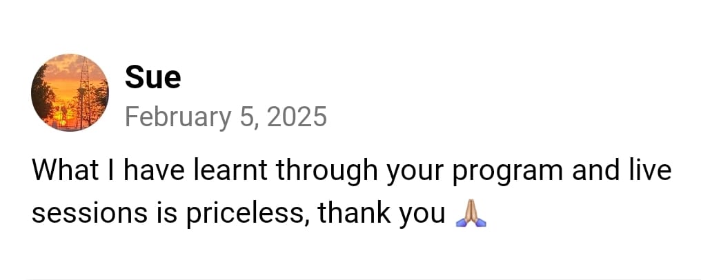 If at anytime you need extra assistance in navigating your unique circumstances, I am here to personally support you in your own private 1:1 messaging for the entire length of the program